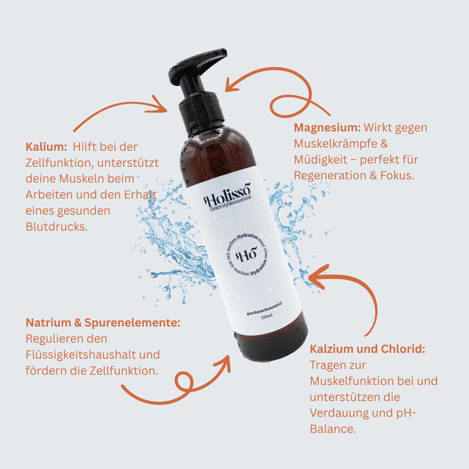 Mit Holisso kannst du eine Vielzahl von Vorteilen erleben. Studien zeigen, dass Elektrolyte wie Magnesium, Kalium, Natrium und Chlorid helfen, den Energiehaushalt zu stabilisieren, Müdigkeit zu reduzieren, das Nervensystem zu unterstützen, die Muskelfunktion zu verbessern und den Blutdruck im Gleichgewicht zu halten.